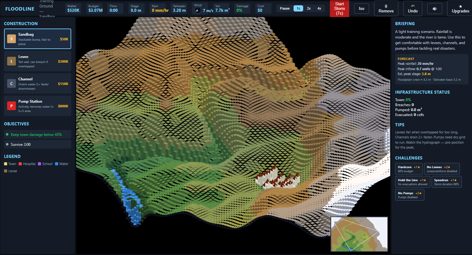 Floodline is a simulation game. Do not use it for design decisions, permitting, construction documents, or any other professional engineering purpose.